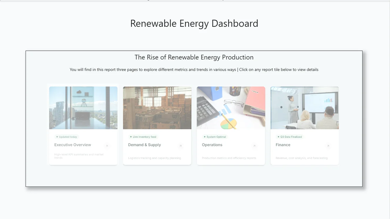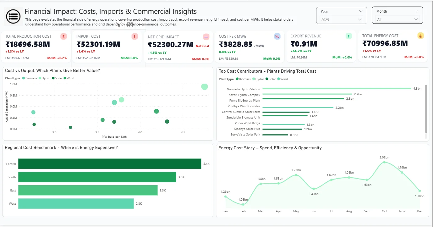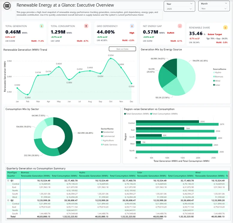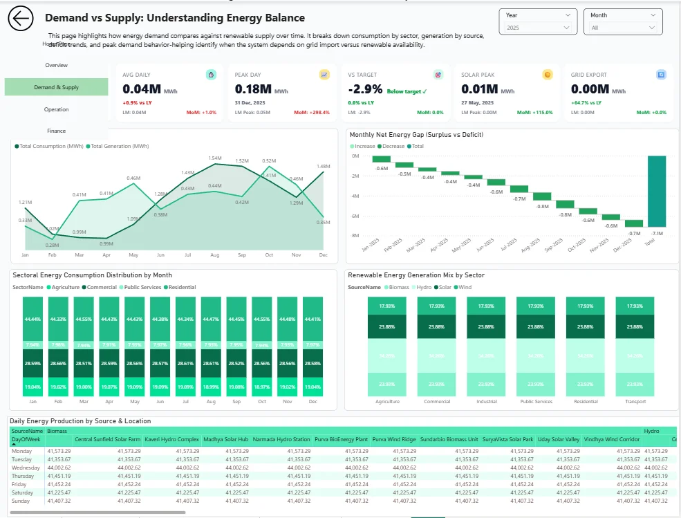 The client had renewable energy generation and consumption data, but it was spread across reports and files, making it hard to see what was happening day to day. The objective of this Power BI Dashboard was to bring demand, supply, plant performance, and cost views into one place so teams could quickly compare regions, track trends, spot gaps, and make faster decisions without digging into spreadsheets.