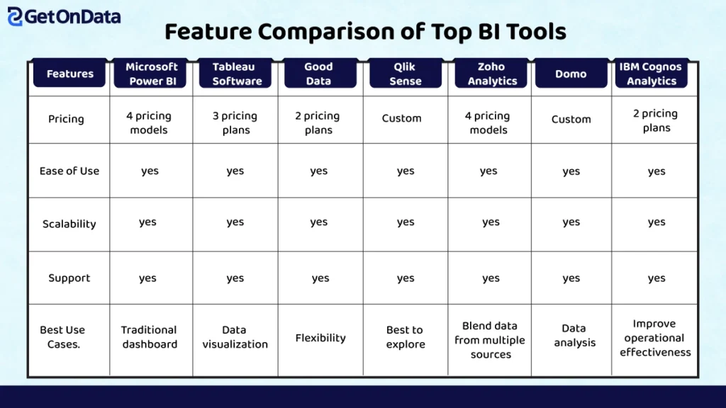 • Scalability- Consider how these top business intelligence tools align with your growing user base & data needs.